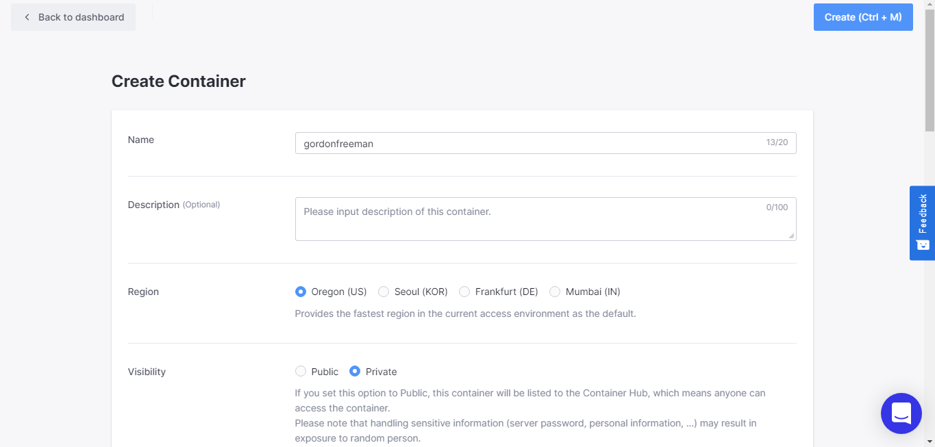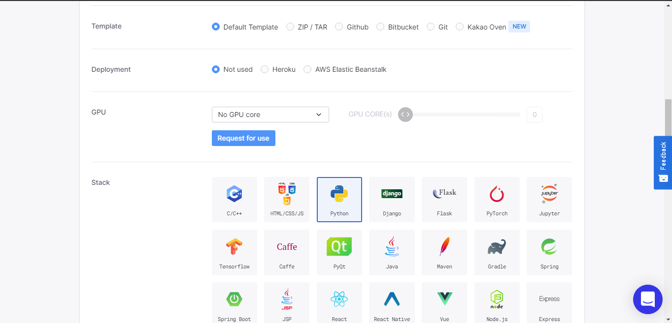 2) Use whatever name, use whatever server region, make it private, and select python stack, and press Create. Ignore other configs.