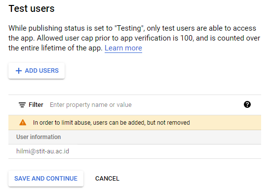• Fill User support email and developer contact information with your google account, and ignore other configs. Press Save and Continue.