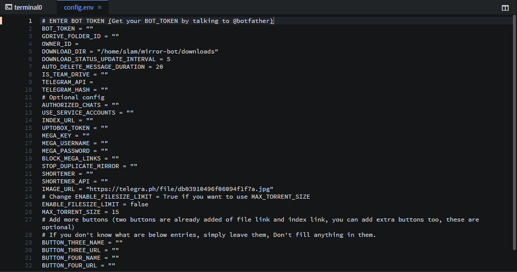 11) Now let's edit the config of the bot. (I'm using config.env for configurations here. The only downside is that you need to redeploy/update the app every time you change the config, if you prefer herok config vars, then just skip this and add manually all the vars in your herok app's config vars)