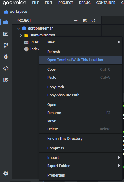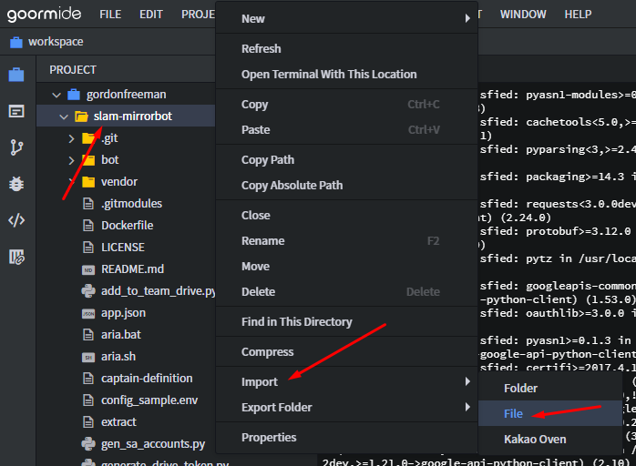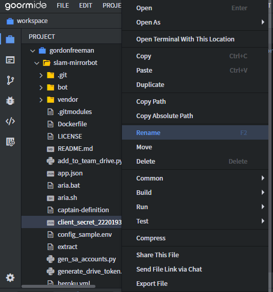 • Back to Goorm IDE tab, right click slam-mirrorbot > Import > File, select the credentials file you have downloaded