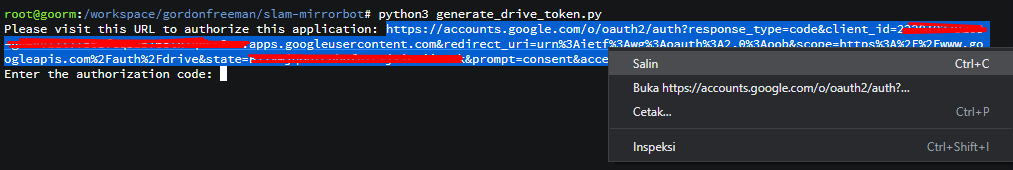 • In the new tab, press your google account and you'll get your authorization code. Copy that and paste to the terminal and press enter. Check if token.pickle is created. If somehow you got some error, check again if you have done all the generating credentials steps nicely, if you have, go to your OAuth screen settings and activate all the scopes and try running the python script again. If it still doesn't work or your app is blocked, ask in the support group