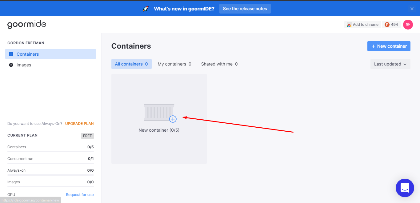 1) Go to ide.goorm.io and log in to your acc, go to dashboard, press New Container.